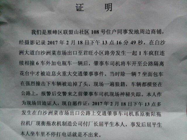 肇事车牌号为湘D369PW,车主为衡阳市白沙洲衡拖农机制造有限公司副厂长屈某某,涉嫌醉酒肇事,万幸的是车祸没造成人员伤亡。