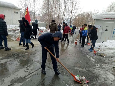 在社区干部的带领下,青年志愿者们分为三组,一组到二级电站残疾人家庭,打扫院内积雪;二组到嘉逸小区周边清扫道路,打扫冰雪,为居民出行提供方便;三组来到阿勒泰市福利院,为福利院的老人们打扫卫生,收拾房间,使老人们拥有一个舒适整洁的生活环境。