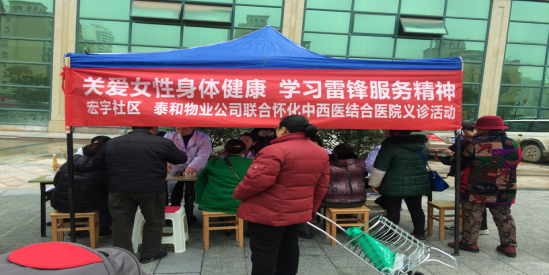 清风网讯:(怀化站 彭宏炳)3月8日是国际劳动妇女节,当天,宏宇社区、泰和物业公司联合怀化中西结合医院开展了主题为 “关爱女性身体健康 学习雷锋服务精神”的义诊活动。