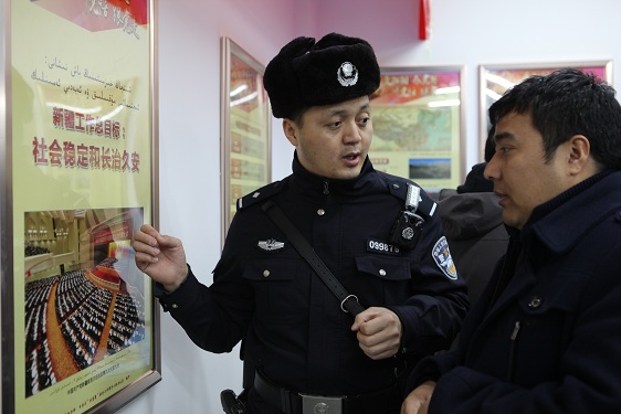 “这是中央领导来新疆看望各族群众时候的合影”。“这是2014年4月28日上午,习近平总书记在疏附县托克扎克镇阿亚格曼干村村民阿卜都克尤木·肉孜家同村民座谈时的场景。”讲解员们向大家介绍着一幅幅图展内容。这边,市地税局张哲对他的亲戚吾马尔·扎衣提说着悄悄话,“前段习近平总书记还给库尔班大叔的孙女回信啦。”“哈,这个我知道,就是想骑毛驴到北京去见毛主席的库尔班大叔嘛”。那边,远征社区民警段文平指着图片和他维吾尔族兄弟艾尼娃·赛依提讲“社会稳定和长治久安是新疆工作的总目标,也是我们全区人民的期盼啊。”