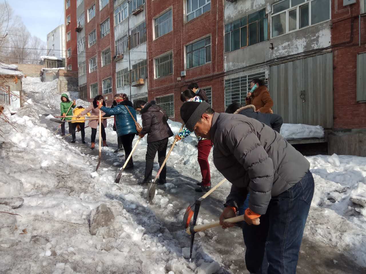 化雪时节,阿勒泰市早晚温差较大,白天积雪融化,晚上又冻成冰,造成路滑不好行走,给清雪卫生工作造成很大的困难,志愿者们手拿十字镐、铁锹、钢钎 推雪板等工具,克服困难,发扬不怕脏、不怕累的精神,干劲十足的打扫着辖区周边卫生。为方便金山一号居民出行,志愿者们还挖出了一条深深的渠沟,使路面积水不在到处流淌,路面也变得干净整洁了。