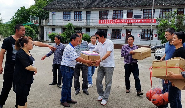 贵州省水投公司董事长金康明(右四)率领驻黄帮扶队到旧州走访石牛小学师生