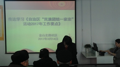 金山北路社区对干部及社区居民就《自治区“民族团结一家亲”活动2017年工作要点》内容开展了培训学习活动