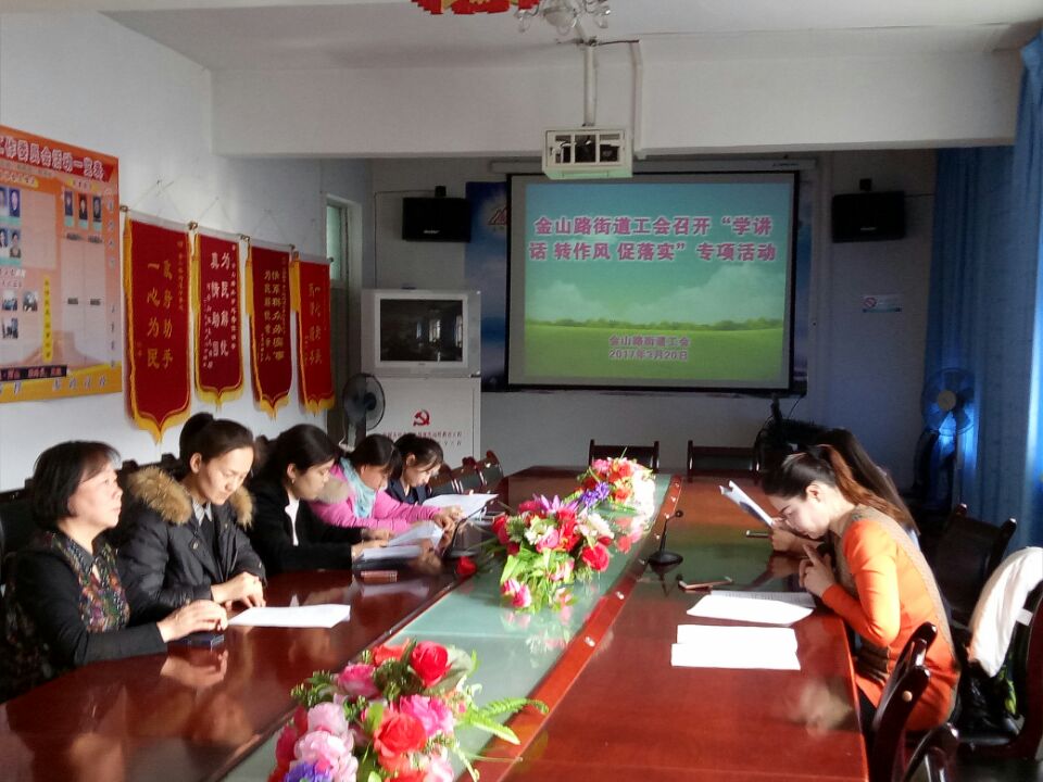 会上,金山路街道街道办事处副主任工会主席朱晓霞组织工会干部认真学习了陈全国、雪克莱提·扎克尔、等自治区领导关于“学转促”专项活动的重要讲话以及《关于在“两学一做”学习教育中开展“学讲话、转作风、促落实”专项活动》。