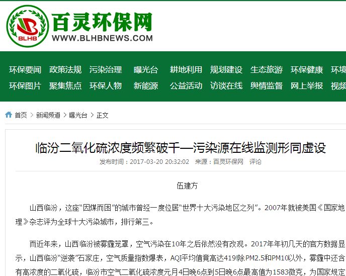 在此之前,为加强临汾市重点污染源自动监控设施建设和监管,深化重点污染源自动监控现场端设备运行管理机制改革,确保重点污染源自动监控设备正常运行,数据真实、准确,临汾市推行自动监控设施第三方运营。最终通过招标由山西鑫华翔科技发展有限公司和山西毅诚科信科技有限公司对市内重点污染源自动监控设备进行运营、维护工作。可是,截止目前,临汾污染问题依旧,空气二氧化硫浓度破千多次被媒体曝光,却未见第三方运营方面的任何动静。