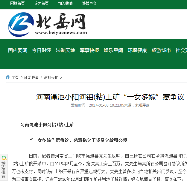 日前,记者接河南省三门峡市渑池县党先生反映,自己所在公司在承揽渑池县陈村乡小阳河铝(粘)土矿的开采中,自2015年5月至今,拖欠其工资上百万,党先生与其所在公司签订协议所欠其款项280万也未支付,同时该矿山的开采存在严重违规行为,党先生曾多次向当地相关部门反映,至今未能解决。为弄清事实真相,记者于2016年12月2日驱车前往当地了解详情。经实地调查了解,事实如下: