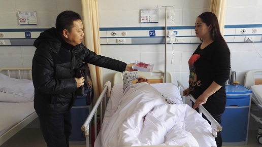 她握着殷建伟的手说:“谢谢工作队,你们带来的钱,缓解了我的燃眉之急,谢谢你们······”说着说着流下激动地泪水。殷建伟说:“我们是一家人,你现在安心照顾病人,工作上的事由社区大家帮你分担,有什么困难你尽管告诉我们,咱们大家一起想办法。”