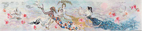 画面上有英国时任首相布莱尔.、法国总理拉法兰.、尼泊尔总统亚达夫等十几位国家的元首和政府首脑题写的和平祝词。尤先科总统认真地欣赏並聆听着画家父女创作这幅巨作的详细经过并非常高兴地取过题字笔,盯看布莱尔首相题写的“我们要世界和平”,希腊总理西米蒂斯题写《我们需要对话,需要讨论,更需要世界和平》,沉思半晌,在黑人美神放飞的和平鸽旁,工工整整地题写了“乌中友谊万岁”。总统听完画家讲述创作历程和世界廵回画展的进程,非常感动,盛情邀请画家父女到美丽的乌克兰举办画展,他说这幅画是呼吁世界和平的号角和宣言!