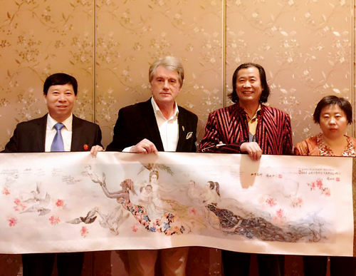 国画大师薛林兴向尤先科总统馈赠浓缩版美神图并在一起合影留念