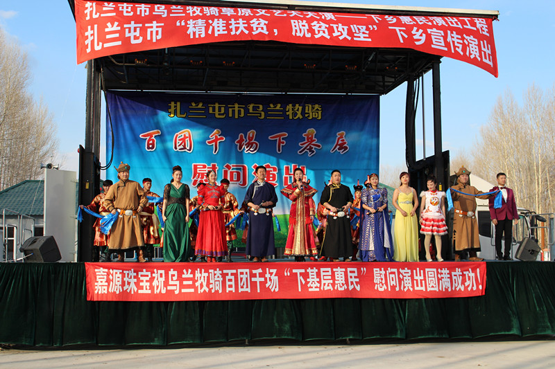 乌兰牧骑的演员们带着扎兰屯市委市政府对基层干部群众的关心与问候,开始了他们形式多样独特、内容新颖丰富的表演。他们将扶贫的惠民政策、脱贫攻坚的重要意义融入到精彩的节目中,向广大基层干部群众进行宣传,既让群众熟知了政策,又丰富了他们的娱乐生活;既展示了扎兰屯市脱贫攻坚的发展成果,又鼓舞了广大干部群众凝心聚力推动扶贫工作的深入开展。