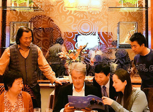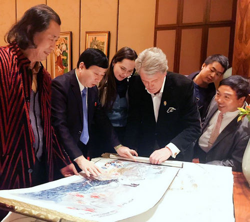 刘瀚锴、列娜首先欢迎尤先科总统在这春意盎然的季节来到美丽的北京并在百忙之中抽出时间与我国著名书画家薛林兴、敖特、刘俊以及刘钇含、聂伟丞等人进行面对面的文化交流。刘瀚锴、列娜同时感谢尤先科总统对薛林兴、敖特、刘俊等各位艺术家作品的高度认可和积极评价!