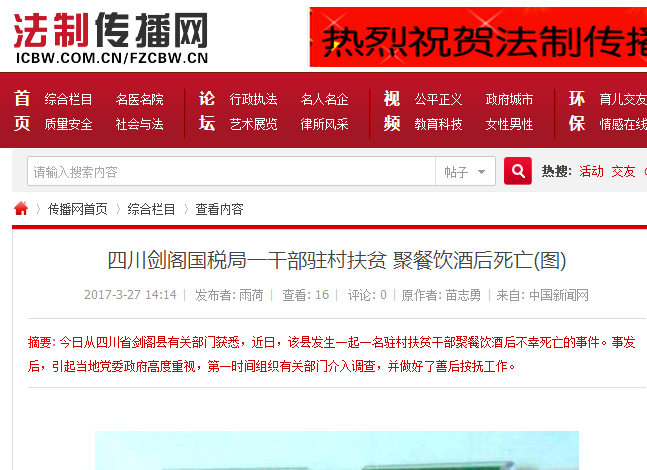 法制传播网综合据中新网广元3月27日电 (苗志勇)记者今日从四川省剑阁县有关部门获悉,近日,该县发生一起一名驻村扶贫干部聚餐饮酒后不幸死亡的事件。事发后,引起当地党委政府高度重视,第一时间组织有关部门介入调查,并做好了善后按抚工作。