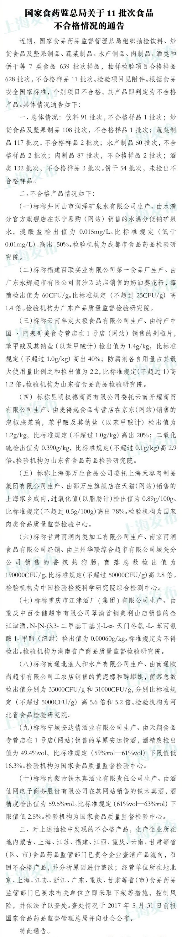 国家食药监总局组织抽检639批次食品,共11批次不合格,包括标称云南牟定太极食品有限公司生产、由特产中国·阿表哥美食专营店在1号店(网站)销售的剁椒片,标称昆明权德商贸有限公司委托云南开耀商贸有限公司生产、由麦得起食品专营店在京东(网站)销售的泡椒腌茉莉等,涉及防腐剂、二氧化硫、苯甲酸及其钠盐超标等问题。