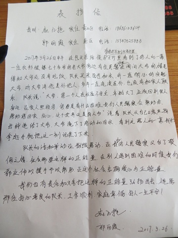 所长曹晓峰了解情况后得知,当天中午12时40分许,执勤队长冯祯在巡视候车室时,发现一位衣衫褴褛的老人在候车室独自徘徊,随即上前询问。老人自称赵连斌,今年75岁,老家在河北省张家口市,多年来,自己一直在外流浪,因年龄越来越大,身体越来越差,十分想念老家,来车站想问问有没有回老家的车票,却又不知道该去哪里询问,正顾盼无助的时候,民警及时出现。民警看到这种情况,不断安慰老人,并劝他身体不好不宜独自乘坐火车出行,得知老人还没有吃午饭,又给他买来面包和水,最后掏出100元钱递给老人,老人接过钱后眼里满含着泪水,握住民警的手久久不放。一旁候车的杜女士目睹了全过程,对民警的举动十分钦佩,于是写下了这封表扬信。