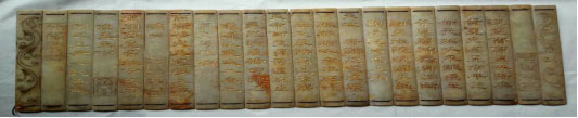(长乐未央)汉室自高皇以降,奕叶重光。迨至孝平之世,元始以来,贼臣王莽篡窃神器,皇纲解纽,炎德陵迟,国步维艰,几成沦鼎。上赖天地宗庙之灵流庆,朕躬始以白水从戎,继发昆阳翦逆。恭膺天命,仰受贞符。遂从臣民之请,爰稽司禄之仪,谨以建武二年三月上旬恭诣高庙,琴式入筵敬上,嶶号曰:(嵩呼万岁)。圣祖高皇帝敕下,相符使闻天下(**)。刊之玉册,以彰崇典。(天禄永昌)