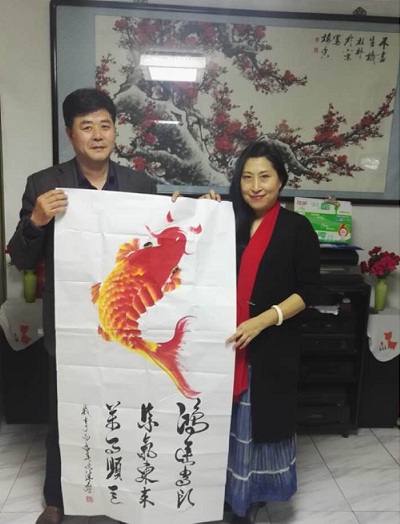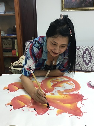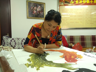 她还先后创作了多幅作品,《鸿运当头》,一鱼飞跃,紫气东来。《九龙图》、九龙翱翔,奋勇争先,势不可挡。《太极鱼》阴阳相合,黑白交融,由散而聚,由无而有,阐释万物之真谛。