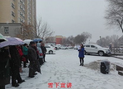 十点钟,在雄壮地国歌声下,鲜艳的五星红旗冲破白色雪花地阻挡冉冉升起,大家地目光紧紧地跟随着国旗缓缓上升,爱国之情油然而生。升旗仪式结束后,来自金山北路的社区书记在国旗下宣讲《新疆维吾尔自治区去极端化条例》。