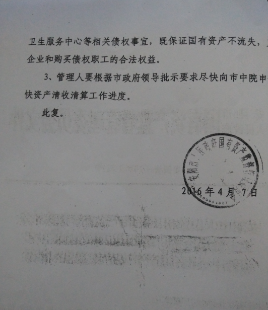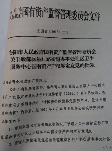 2016年4月安阳国资委管理人单方界定该中心现有的私有资产为纱厂国有资产,在该中心资产持有人(姚运平等40人)不知情的情况下,国资委依据管理人资产界定意见,无视河南省高院的裁决,单方做出批复,该中心知道此事后,多次向国资委索要界定意见和批复,国资委均拒绝提供,剥夺了该中心资产持有人的合法权利,资产界定意见与事实不符,国资委界定程序不符合规定。国资委和管理人并以此界定及批复来蒙蔽领导欺上瞒下。