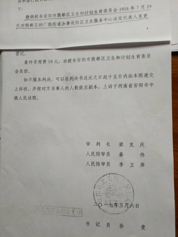 殷都区卫计委办理法人变更速度之快令人质疑,是否存在内幕交易?该中心人员先后到市政府、市信访办上访,他们均告知无法受理,无奈只好向省政府上访。并起诉殷都区卫计委变更法人的不合法,安阳市北关区法院(2016)豫0503行初37号判决撤销 殷都区卫计委关于纱厂社区服务中心法人变更的判决.