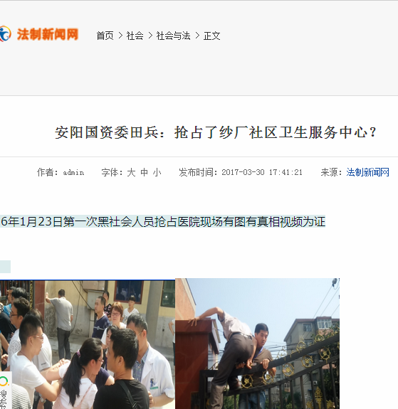 人民法制报据华宇卫视讯:近日,多次接到河南安阳纱厂社区服务中心职工举报,举报安阳国资委纱厂管理人田兵违法事件。在河南安阳出现一起骇人听闻的事情, 2016年7月29日上午河南省安阳市国资委副调研员、河南省豫北棉纺织厂管理人田兵和安阳市中级人民法院破产庭2人无任何执法手续,公然调动近200名警察和特警手持盾牌、警棍、佩戴枪支,指挥社会闲杂人员砸开安阳市殷都区纱厂街道办事处社区卫生服务中心大门,将该中心医务人员驱赶出去,完全不顾住院病人安危,强行霸占该社区卫生服务中心的办公场所。是什么原因让国资委人员竟敢在光天化日之下抢占社区卫生服务中心?是什么原因解决一个社区卫生服务中心问题还需要如此兴师动众?