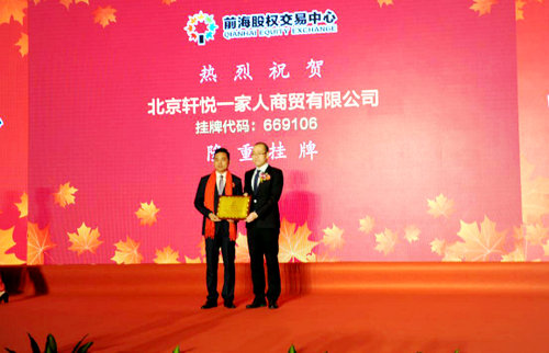 前海股权交易中心杨新宇为北京轩悦一家人商贸有限公司(董事长周海兴)授牌