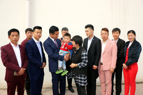 爱心企业家周海兴紧紧拥抱脑瘫儿童光光和志愿者合影留念