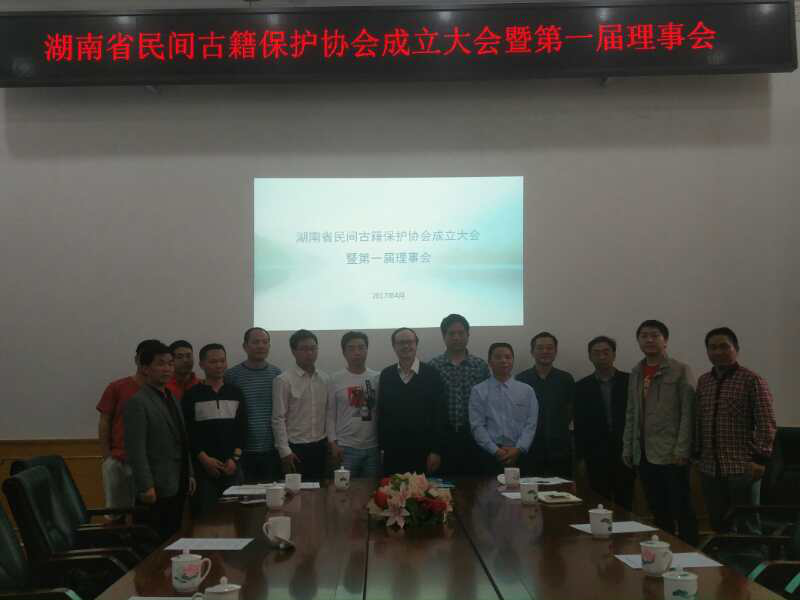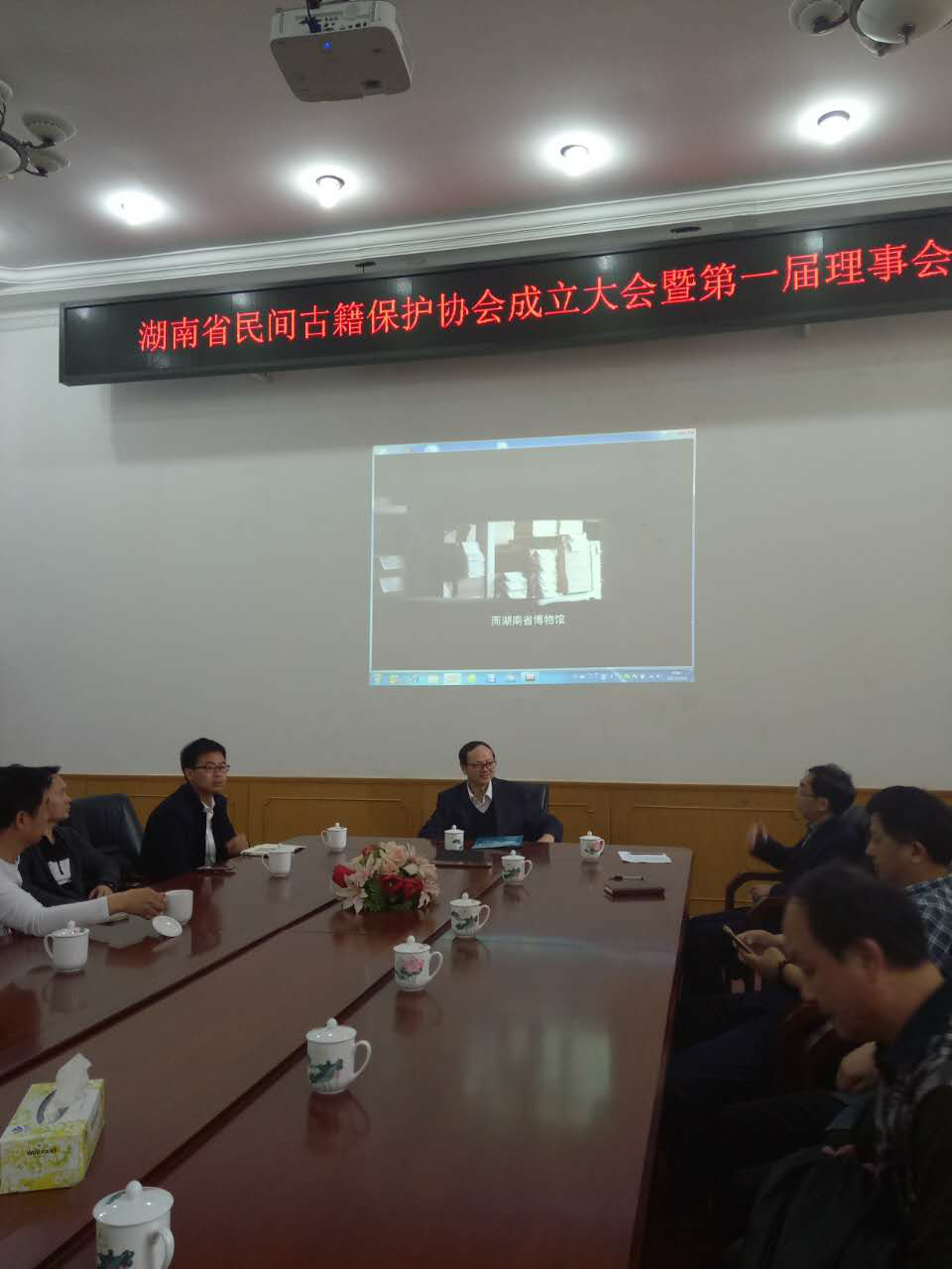 加强民间力量的参与是中国古籍保护工作未来开展的重心之一。在这种形势下,湖南省图书馆,湖南省古籍保护中心倡导成立了湖南省民间古籍保护协会,旨在发动各私立收藏单位、古籍爱好者及古籍经营从业人员等,集思广益,开展古籍保护、传承、研究及其相关活动,促进湖南省乃至全国古籍保护工作的开展。湖南省图书馆雷树德副馆长出席了成立大会,并发表讲话,指出湖南省民间古籍保护协会成立的重要意义,谈到民间收藏对于古籍保护工作的重要影响,并表示湖南省古籍保护中心将进一步提供指导,协调相关工作的展开。协会筹委会主任,湖南省古籍保护中心办公室主任,协会总顾问寻霖研究员介绍了协会筹备工作,并对协会工作的进一步开展作了重要指示。湖南大学文学院讲师向铁生任协会会长,秦庆涛任秘书长,龙桂生任常务副会长,欧阳富、王志祥、喻其军、玉昆、李云帝、许向东六人任副会长。协会将在湖南省古籍保护中心的指导下,广泛发动,积极宣传,凝聚民间古籍爱好者的力量,开展古籍保护工作。明确了下一步工作,完善协会章程,重点开展古籍保护相关知识讲座,举行私藏古籍善本展览,加强会员之间的交流联系等。