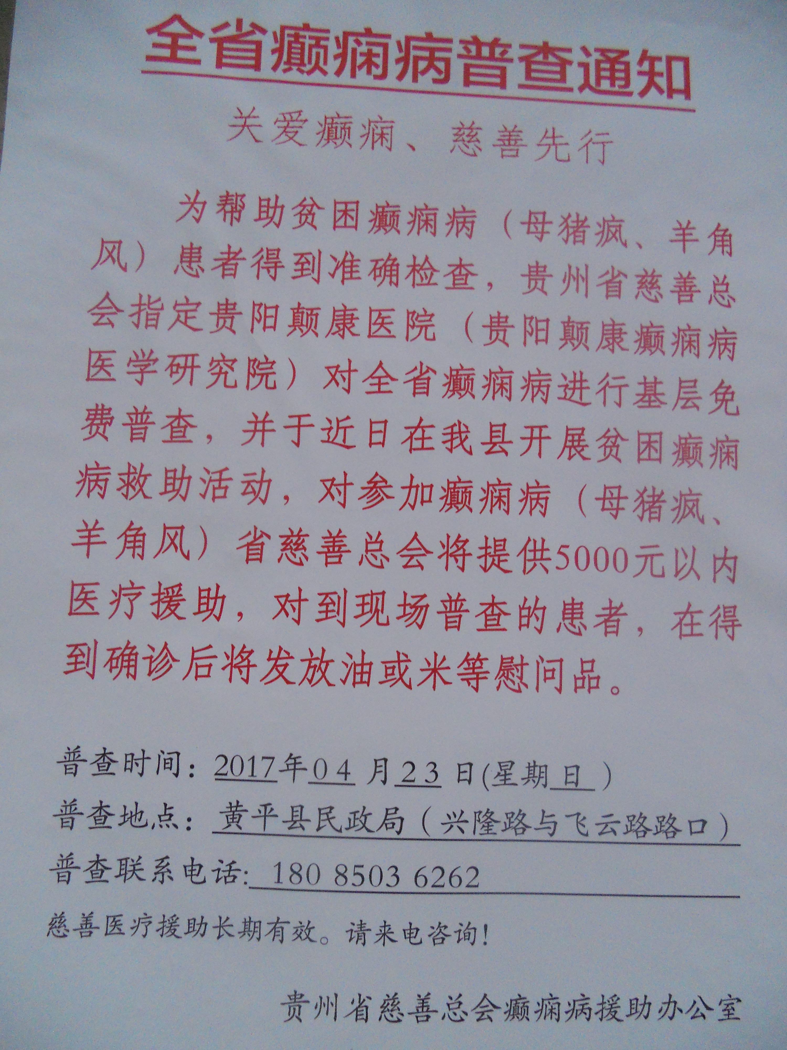 此次普查活动,是为帮助贫困癫痫病(母猪疯、羊角风)患者得到准确检查,贵州省慈善总会指定贵阳颠康医院(贵阳颠康癫痫病医学研究院)对全省癫痫病进行基层免费普查,并于4月23日在黄平县开展贫困癫痫病救助活动,对参加癫痫病(母猪疯、羊角风)省慈善总会将提供5000元以内医疗援助,对到现场普查的患者,在得到确珍后将发放油或米等慰问品。