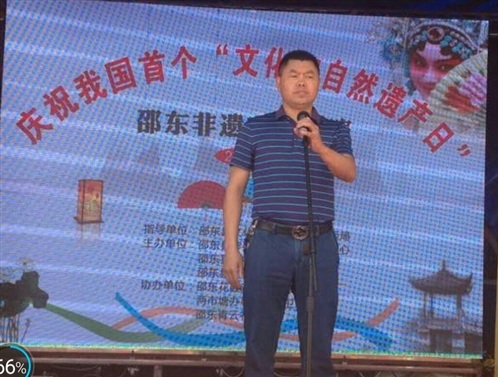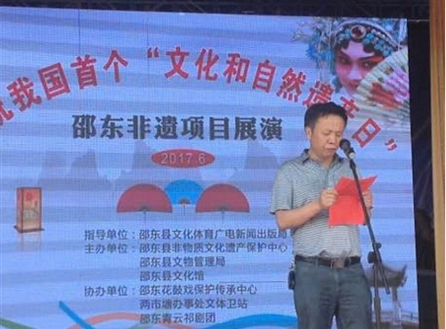 2017年06月10月,邵东县两市镇云山村,庆祝首个“文化和自然遗产日”邵东县文化体育广电新闻出版局局长李友良,两市塘街道办事处党工委书记李佑军,县非物质文化遗产保护中心,县文物管理局,县文化馆,县花鼓戏保护传承中心,两市塘办事处文体卫站,邵东青云祁剧团,及县非遗传承人项目展演。