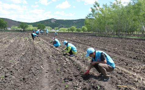 驻村工作队、包扶单位、包村干部正在帮助于清江家栽种万寿菊