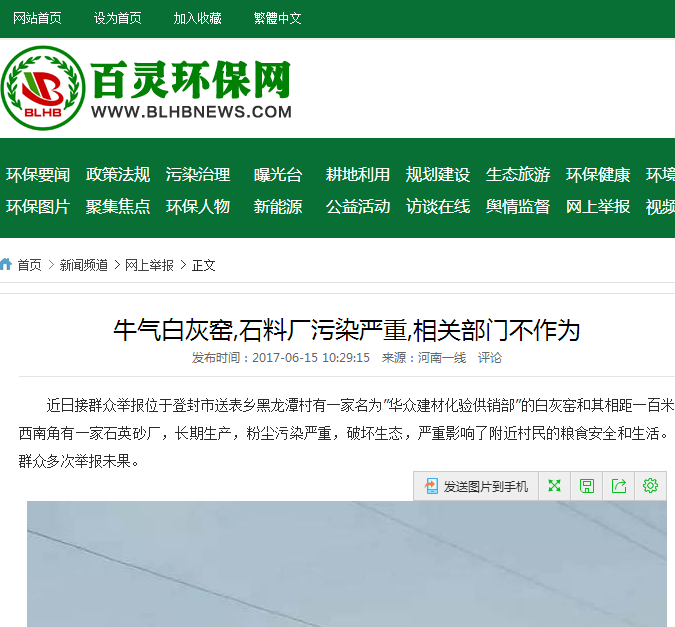 备份栏目近日接群众举报位于登封市送表乡黑龙潭村有一家名为”华众建材化验供销部”的白灰窑和其相距一百米西南角有一家石英砂厂,长期生产,粉尘污染严重,破坏生态,严重影响了附近村民的粮食安全和生活。群众多次举报未果。