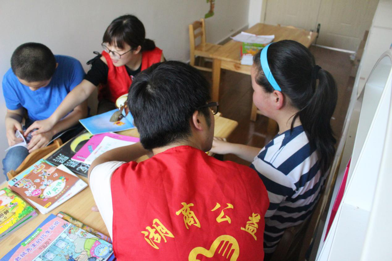 志愿者通过讲故事的互动形式与孩子互动,来吸引自闭症儿童的注意力。虽然有些孩子不愿配合,但在志愿者的耐心安抚下,所有孩子们围成一圈,认真聆听志愿者阅读手中的故事。故事课堂旨在锻炼自闭症儿童的注意力,也是志愿者为辅助自闭症儿童走向健康的创新方式。