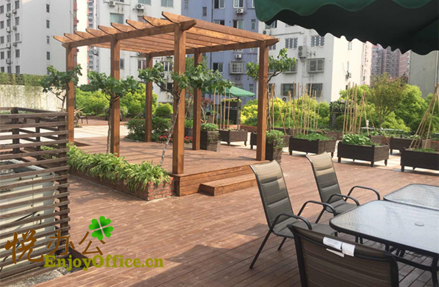屋顶花园.舒适的躺椅,绿色的盆栽,太阳伞下小坐有没有感觉很惬意