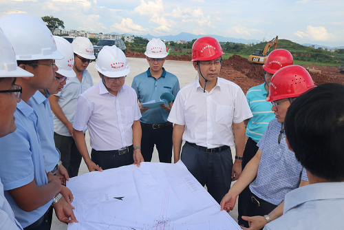 在赣州西站平面布置图展板前,徐利锋详细了解了目前赣州西站的建设情况和施工进度。听取了施工单位负责人就赣州高铁新区、核心区公共地下空间一期预留地铁工程,赣州西站动车场及动车走行线相关工程等建设情况和赣州西站动车场及周边地方轨道交通工程、包括19条道路等综合配套设施设计规划等情况的介绍。