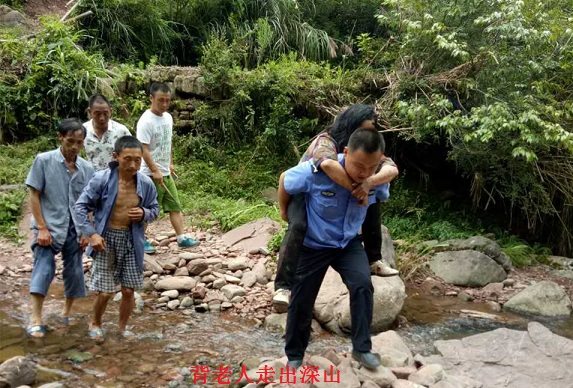 当言奶奶看到救援人员的那一瞬间,泪流满面,半天说不出话来。民警和村民合力将言奶奶救援到安全地带后,民警脱下警服铺在地上让言奶奶躺着稍作休息,给其补充适当的水份,在进行了简单的身体检查后,民警与言奶奶通过交谈进行心理疏导,以缓解老人的紧张情绪。片刻后,言奶奶神色有些缓和,为不延误伤情的救治,民警背起老人走了十几里路走出深山,将其送上了120救护车。