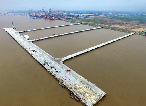 据悉,通海码头一期工程,位于苏通大桥长江北侧下游2公里,南通市与海门市交界处。码头泊位设内档、外档两个平台,其中外档设置3个7万吨级海轮泊位,泊位长度958米,内侧设置1个5千吨级驳船泊位,泊位长度208 米,宽14米,共分14个分段。码头平台总面积4万多平方米。码头平台与后方陆域通过设置3座引桥衔接,引桥长度分别为655米、658米、662米,宽度均为16米。码头共打桩2419根,其中PHC管桩2302根、钢管桩53根。