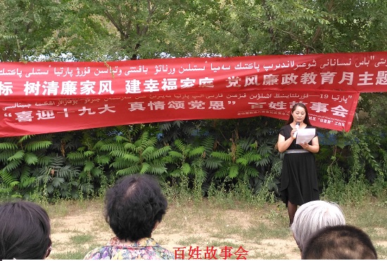 社区干部热依汗古丽向参加活动的党员、干部讲了《维系最难一家人》的故事,她用生动而动情地向大家讲述了驻八道巷工作队帮扶侯洪斌老人安详走过他人生最后一段路程、帮他的遗孀林淑芬解决了生活困难问题、送赵淑芳老人进敬老院的真实故事。在热依汗古丽的带动下,居民党员们纷纷上台讲述自己身边的感人小故事。通过党员们用心用情的讲述,大家发现原来自己身边就有那么多的感人真实故事,这是自己之前没有意识到的,大家纷纷表示要相互关心、相互帮助,邻里守望,共创和谐的幸福生活。