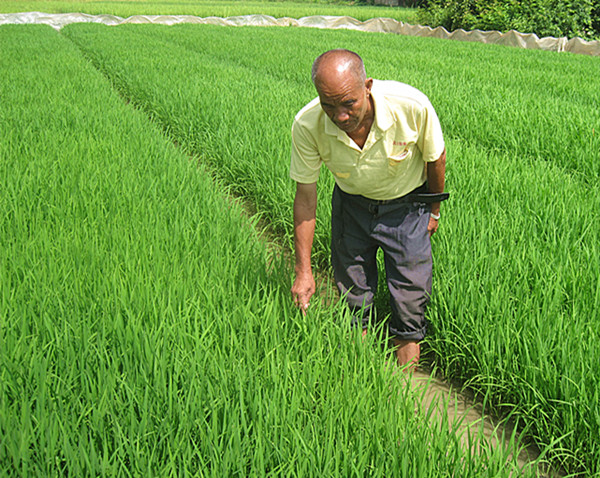 罗同民在观察晚稻秧苗的生长情况