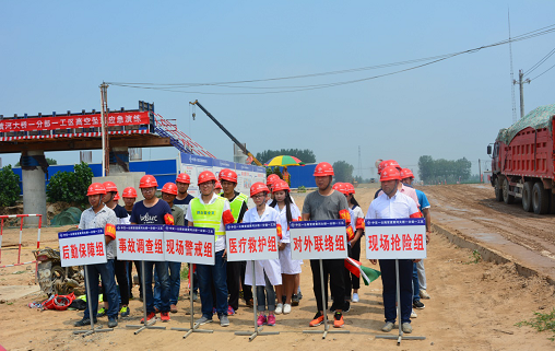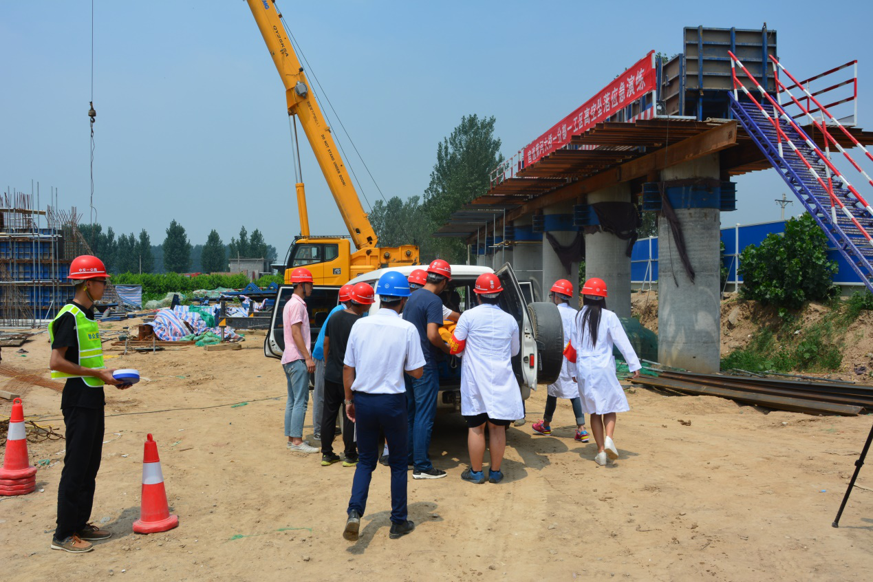 演练模拟场景为一名施工人员在盖梁施工平台走动时,由于顶头围挡缺失,导致施工人员失足坠地。项目经理李文龙接到报告后,下达命令:“立即启动高空坠落应急救援演练,各应急小组立即就位,由现场指挥鲁涛指挥各小组展开救援工作”。现场指挥鲁涛立即对各小组下达指令,现场抢险组奔赴现场清理杂物及危险设施,防止发生二次伤害;警戒组在现场拉起警戒带,同时指挥周围车辆通行,不要驻留围观;医疗救护组对受伤人员进行受伤情况查看及前期伤口处理。受伤人员被送到医院做进一步查看,事故调查组查明事故原因,现场恢复正常施工秩序,整个演练圆满结束。