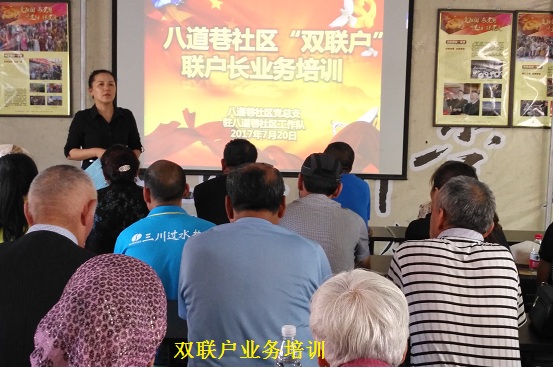 清风网综合讯:(通讯员 沙永强)7月20日下午,为了充分发挥“双联户”长的作用,进一步提高辖区“双联户”长的责任意识、维稳意识,增强联户长爱国情怀,八道巷社区和驻社区“访惠聚”工作队组织辖区50余名联户长进行业务培训和对“爱祖国、感党恩、听党话、跟党走”系列挂图宣传活动。