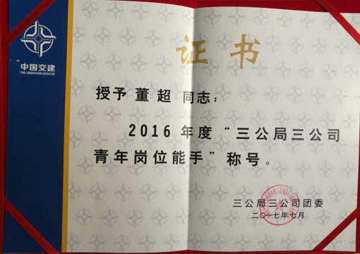 清风网综合讯:(特约记者 常魁星 通讯员 张波)7月18日,中交三公局第三工程有限公司团委授予董超2016年度“青年岗位能手”称号,并颁发荣誉证书。