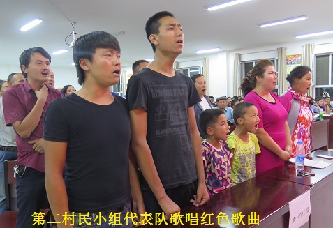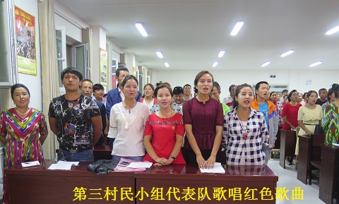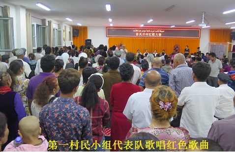 该村3个村民小组代表以6首红色曲目为固定参赛内容。整场比赛在1小队村民合唱《没有共产党就没有新中国》的歌声中拉开了序幕,选手们精神饱满、群情激昂,用真挚的情感激情演唱,高声唱出了对党和祖国的热爱。接下来的《国歌》、《歌唱祖国》、《和谐新疆》、《爱我中华》等一首首令人激昂奋进的红色歌曲把比赛一次次推向高潮。台下观众喝彩声、掌声、加油声此起彼伏、气氛热烈。最后在3小队《团结就是力量》的歌声中,整场比赛落下了帷幕。