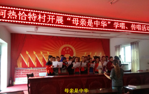 “太阳、星星月亮是天上的一家......”、“起来、不愿做奴隶的人们......”全体村民在党支部书记塔依尔·吐尼牙孜的带领下正在学唱《母亲是中华》,通过嘹亮的歌声表达自己的爱国热情,深切抒发各族干部群众的爱国情怀。