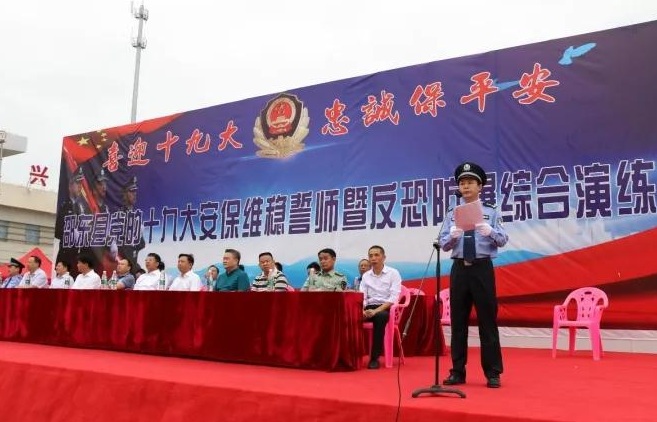 上午9时30分许,随着邵东县委书记沈志定一声令下,邵东党的十九大安保维稳誓师暨反恐防暴综合演练开始。