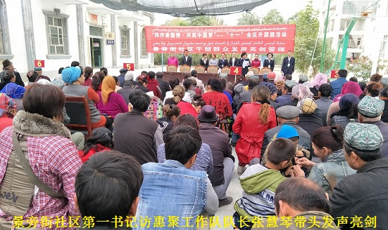 升国旗仪式结束后,景旁街社区第一书记、访惠聚工作队队长张慧琴围绕近期维护社会稳定和陈全国书记的重要指示等内容进行了发生亮剑,并带领党员干部群众进行了集体发声亮剑。