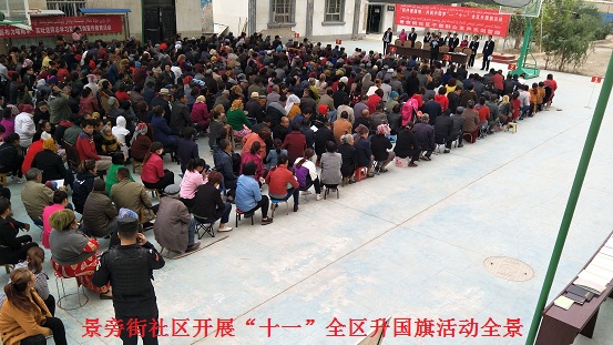 访惠聚工作队队长张慧琴说:在中华人民共和国成立68周年,景旁街社区开展了给家家送国旗、给户户挂国旗、人人唱国歌的活动,通过唱国歌、升国旗,进一步激发广大的居民群众热爱祖国、热爱家乡的情怀,今天开展的升国旗活动主要目的就是让我们每个人都为我们伟大的祖国喝彩,为我们生活在中国感到骄傲,喜迎党的十九大会议胜利召开。