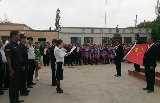 在村党支部书记的带领下,全体党员干部、工作队员和村民群众用维、汉语集体宣誓,坚决地表达了同“三股势力”作斗争,不做“两面人”,抵制宗教极端,永远爱党爱国的决心。
