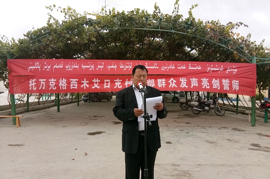 为进一步表达广大村民向“三股势力”和“两面人”宣战的决心,村党支部书记麦麦提·麦米提勒代表全体村民以《 反对“三股势力”践行忠诚》为主题发声亮剑,积极号召广大村民牢固树立维护社会稳定总目标,以实际行动爱祖国感党恩,努力实现自治区党委确定的“聚焦总目标,大干五十天,实现‘三不出’,喜迎十九大”的目标。