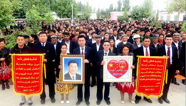清风网讯:(通讯员 昆仑银行 刘文胜)10月1日清晨,在沙雅县古勒巴格镇色日克苏盖提村庄严隆重的国庆节升国旗仪式上,村民热比也木·巴拉提和阿依尼沙·依斯拉木两个家庭向昆仑银行赠送两幅绣匾,分别是习近平总书记肖像和“我爱中华”绣匾,她们把两幅绣匾送到昆仑银行“访惠聚”驻村工作队员手上,再三叮嘱一定要代为赠送给昆仑银行党委。