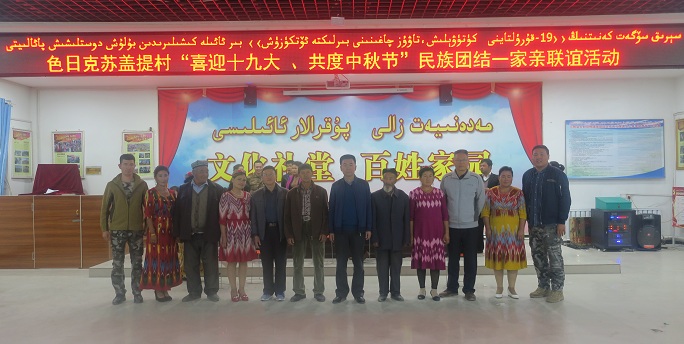清风网讯:(昆仑银行 艾力江 ·喀迪尔)金秋十月,瓜果飘香,在中秋佳节之际,昆仑银行驻色日克苏盖提村工作队与村党支部共同邀请啤酒花社区、阿克艾日克村汉族亲戚欢聚一堂,开展喜迎十九大、共度中秋节“民族团结一家亲”联谊活动。全体工作队员、本村党员干部与自己不同民族亲戚共计250余人参加了联谊活动。